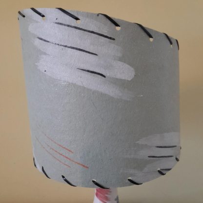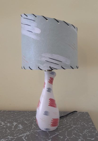 Vintage ceramic lamp in abstract style. Made in UK by H J Wood. Great vintage condition with no chips or cracks. Muted orange, grey/blue and black pattern paired with a grey/blue fibreglass abstract shade with orange, white and black pattern and gold glitter. Stand 40cm high with 20cm diameter lampshade.