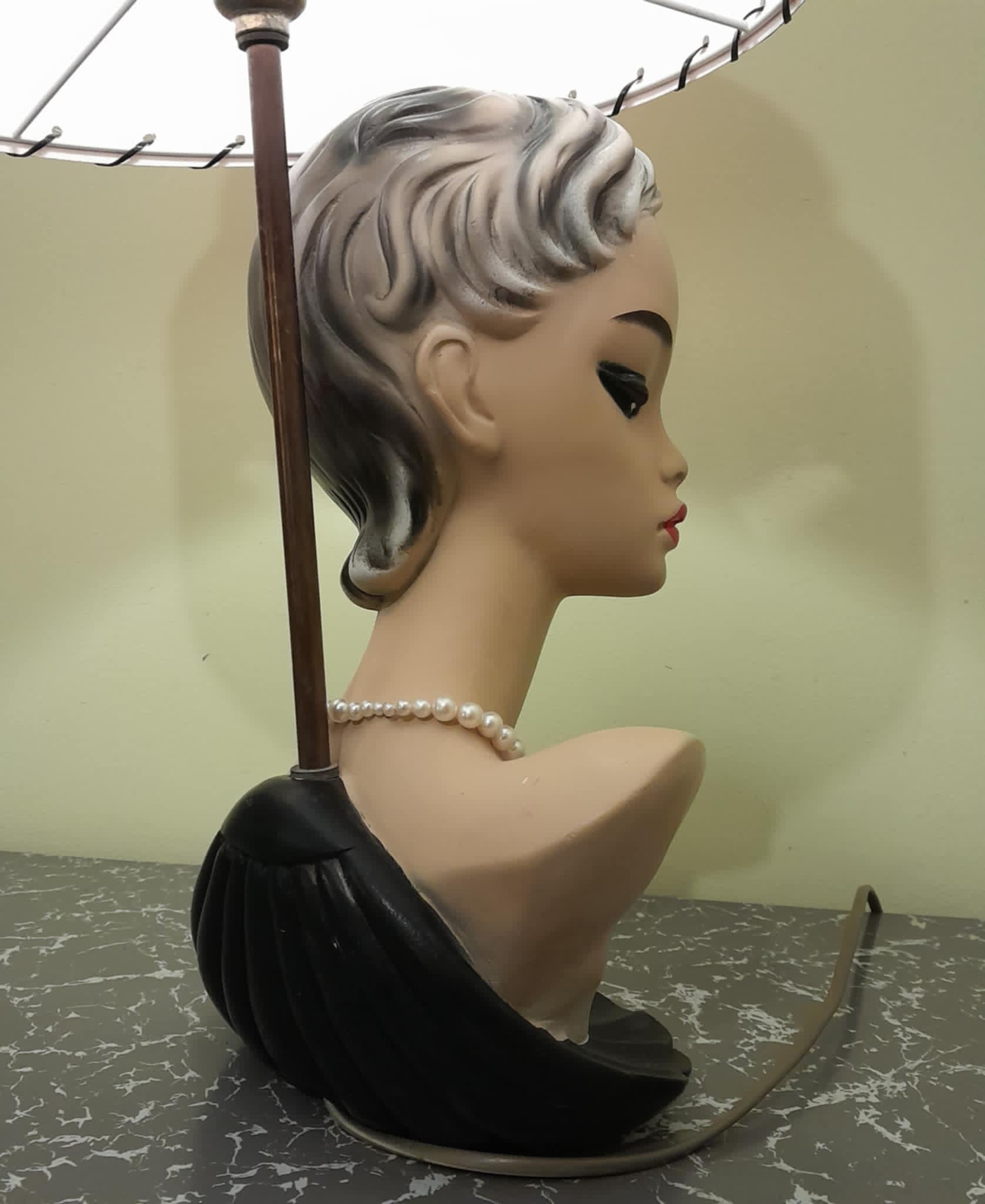 Absolutely stunning original 1950’s vintage chalkware lamp of a rather classy looking young lady, in near mint condition, quite a rare piece as these don’t come up very often. Her necklace isn’t original to the lamp and can be easily removed, but it really does suit her. You probably wont find a better example of this lamp in original condition. Paired with a reproduction Retrashade 2 tier fibreglass shade in soft pink and black, with gold fleck and glitter finished with black lacing.