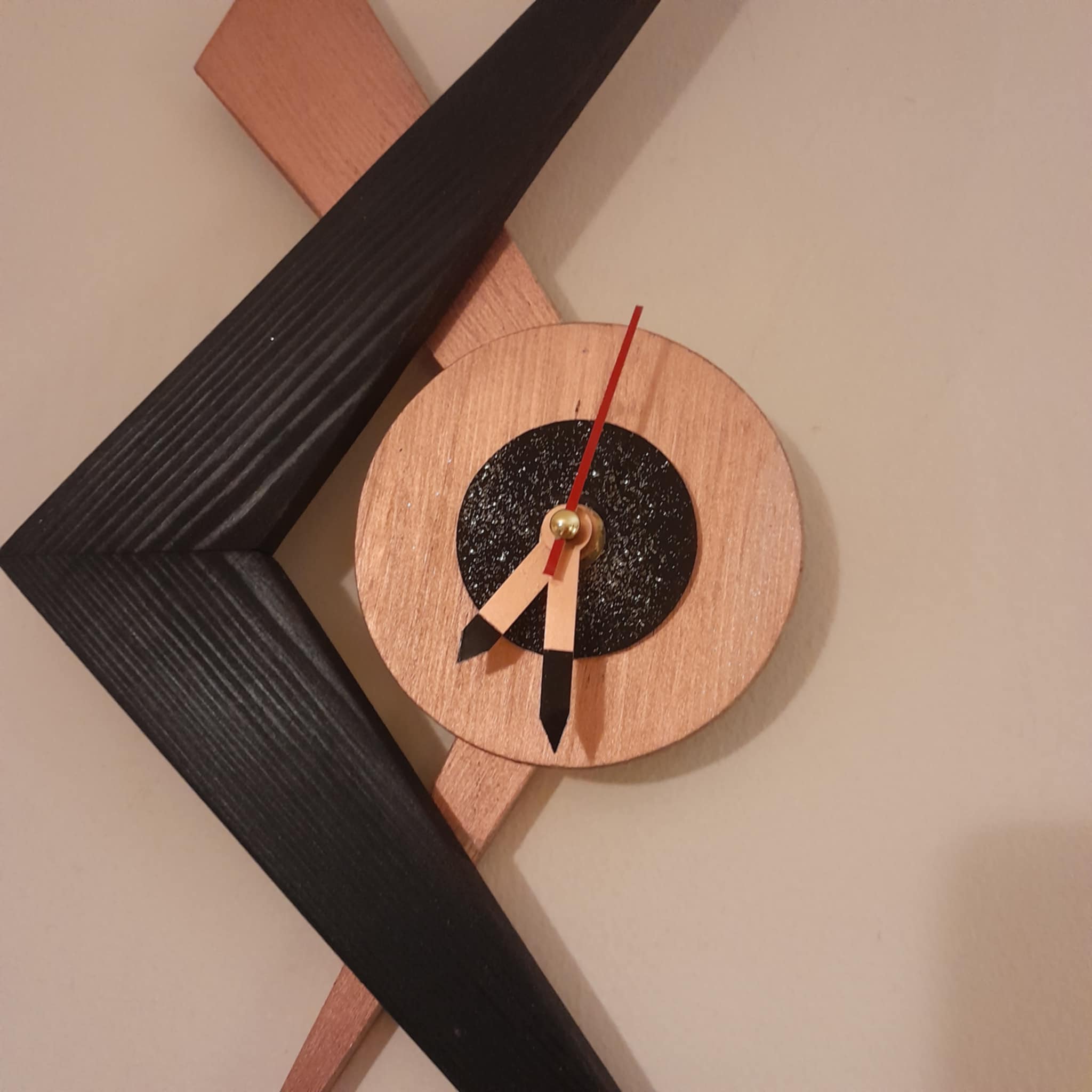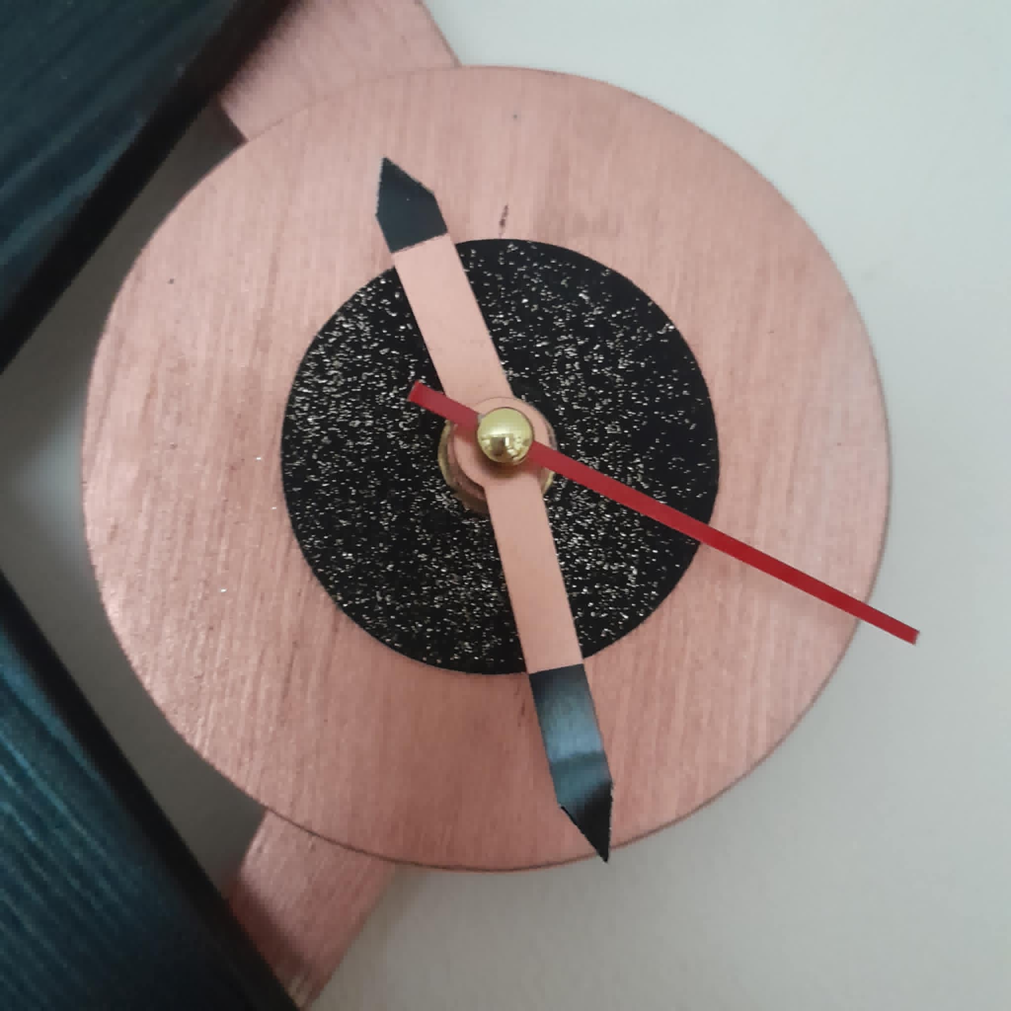 Retrashade atomic boomerang clock made from top quality pine finished in black and rose gold with a black face and gold glitter effect. This clock is made in homage to the original 1950s boomerang clock.