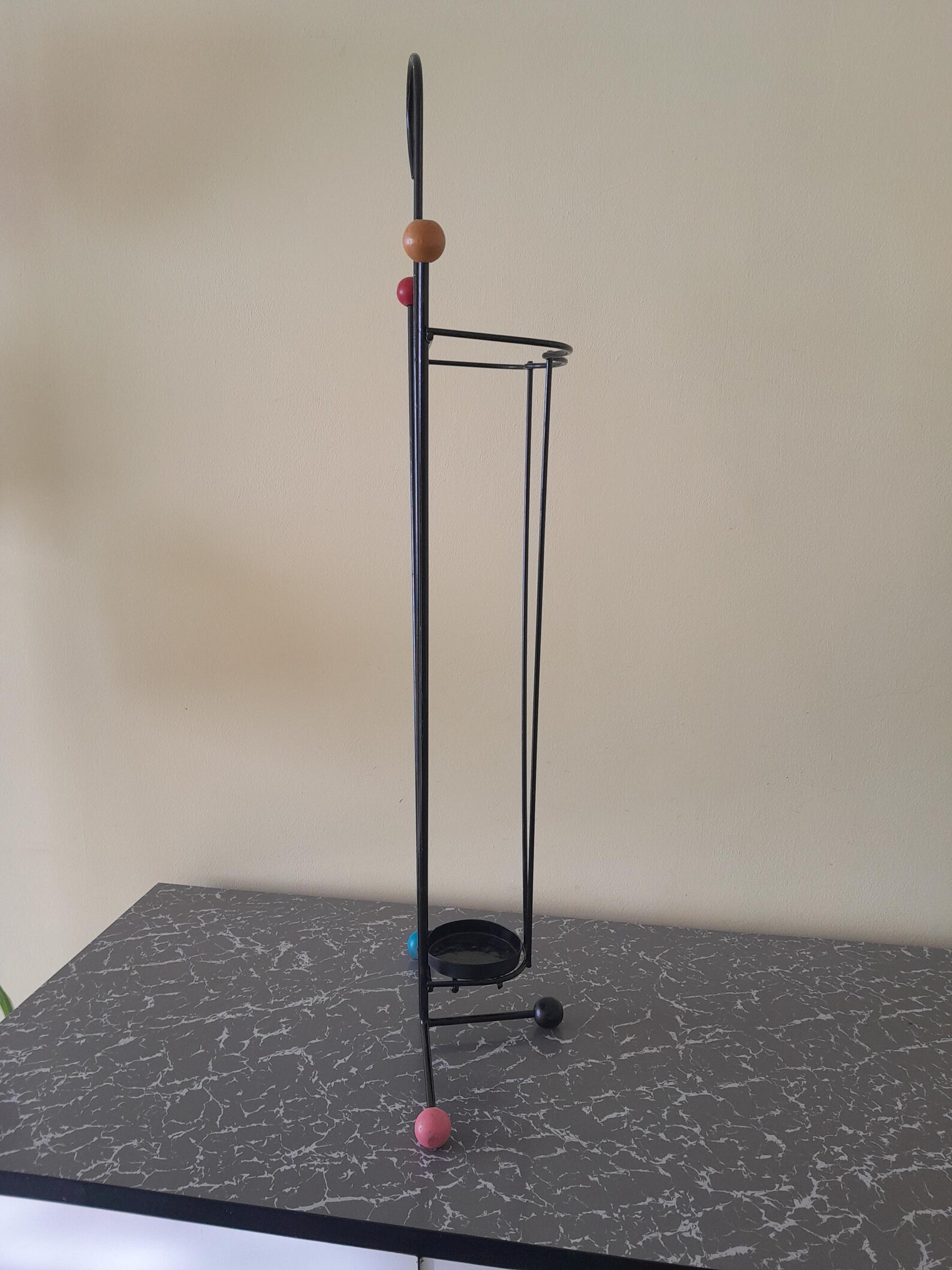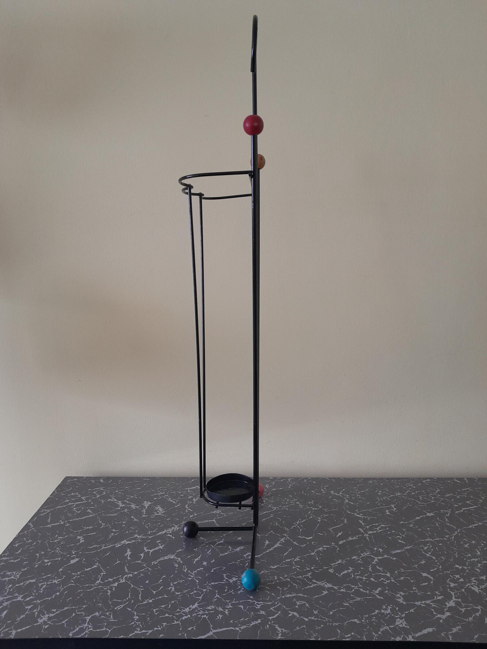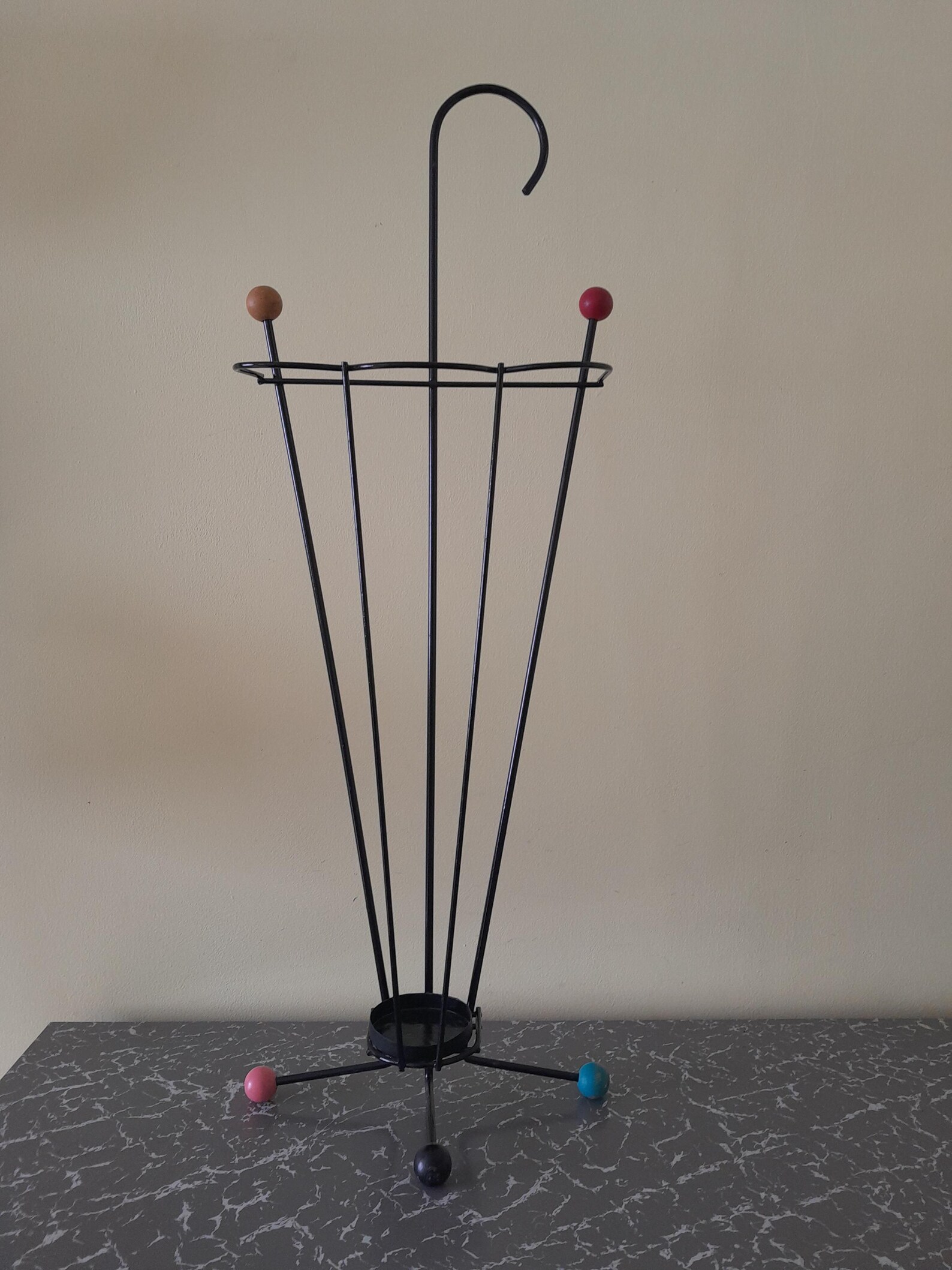 1950’s umbrella stand. Black metal with wooden atomic ball feet. In good used vintage condition. The metal wire has been resprayed at some point and is good and straight with no rust. The wooden balls are in decent condition with a bit of fading to the colours and the odd scuff. Please see photos. The stand measures approximately 77cm high and 28cm at the widest point.