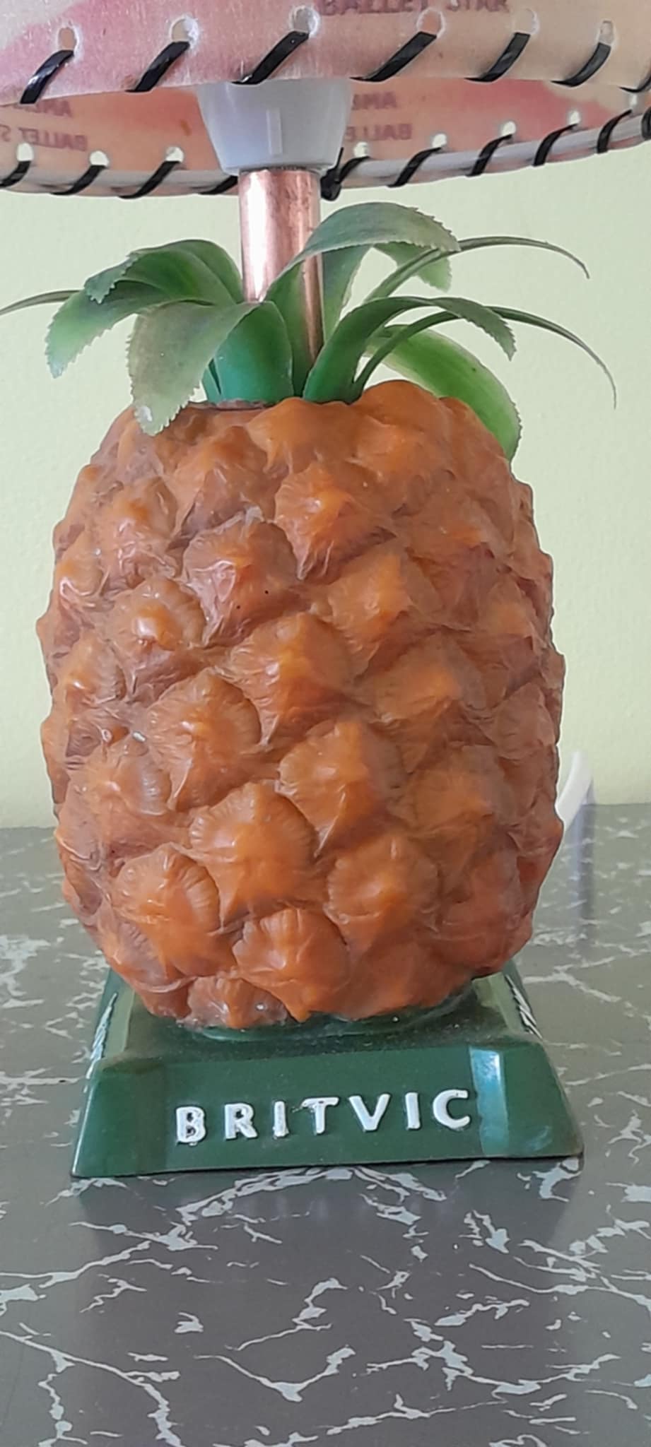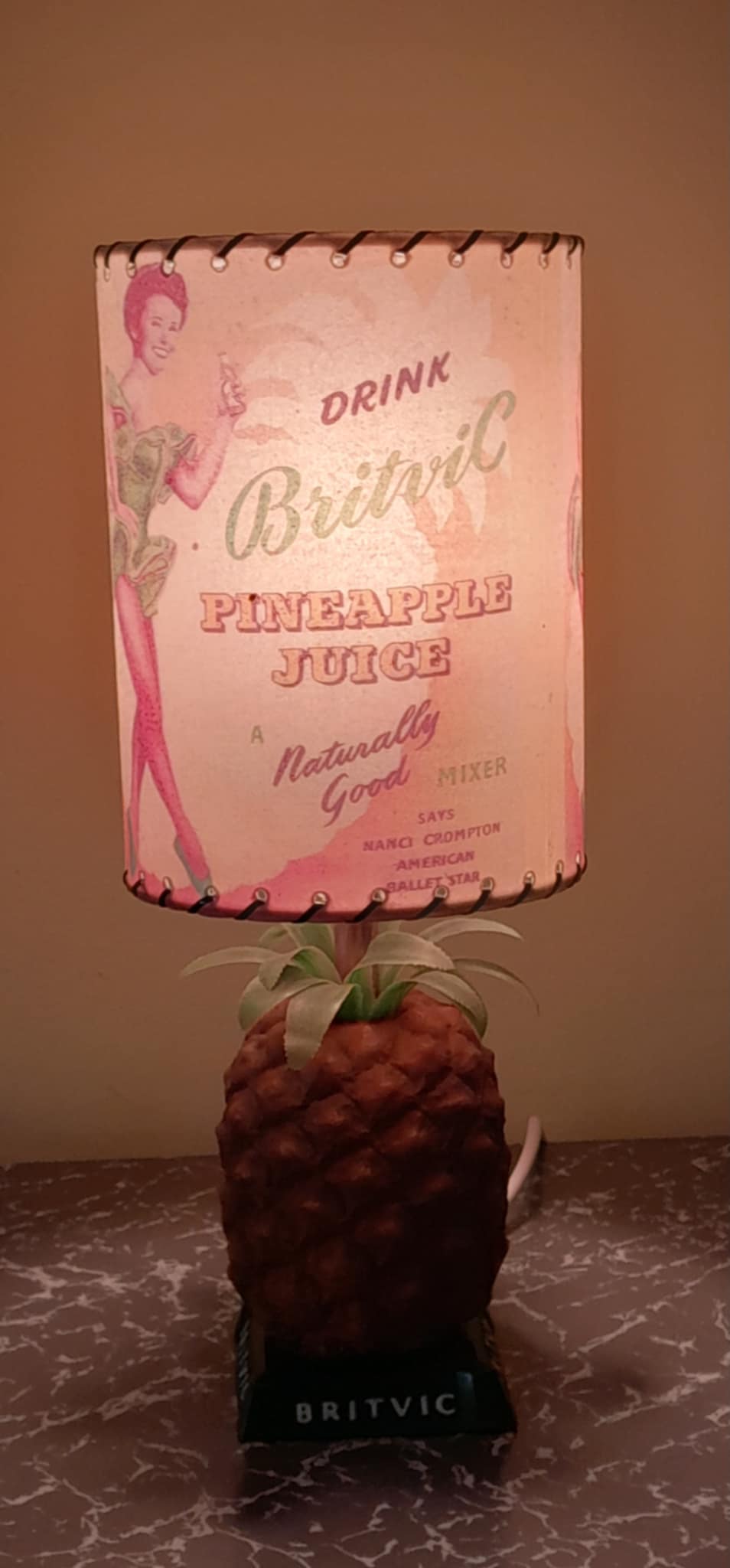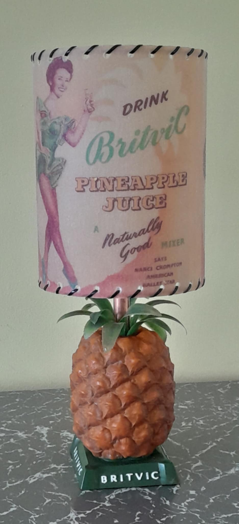 A rare mid-century Britvic pineapple lamp in great condition fully rewired, with a Retrashade fibreglass shade depicting a vintage Britvic advert. Great addition for your home bar