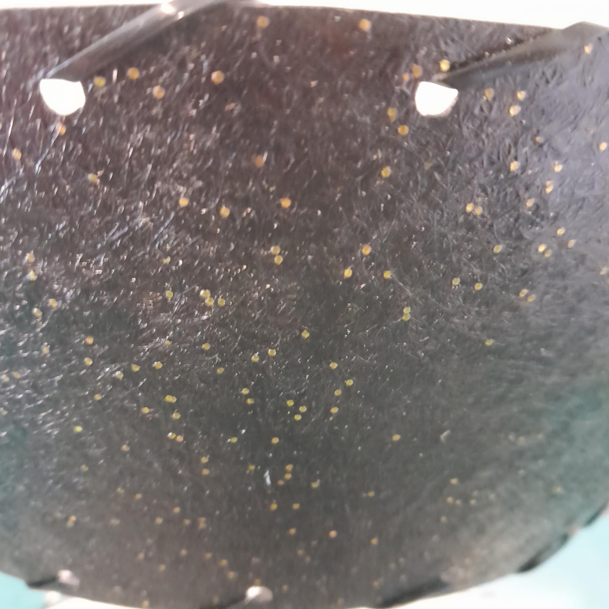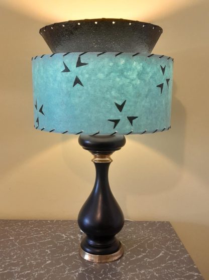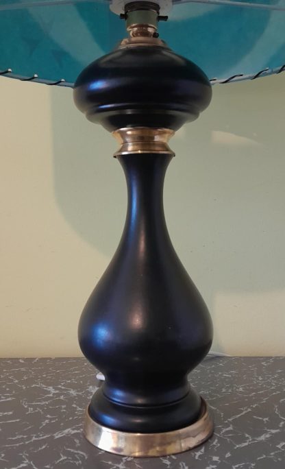 Vintage decorative ceramic lamp in black with gold coloured metal base and decoration. in good vintage condition with slight tarnishing to the gold. Paired with a 2 tier blue and black lampshade with gold glitter and an atomic 1950’s pattern. 58cm tall 35cm diameter shade