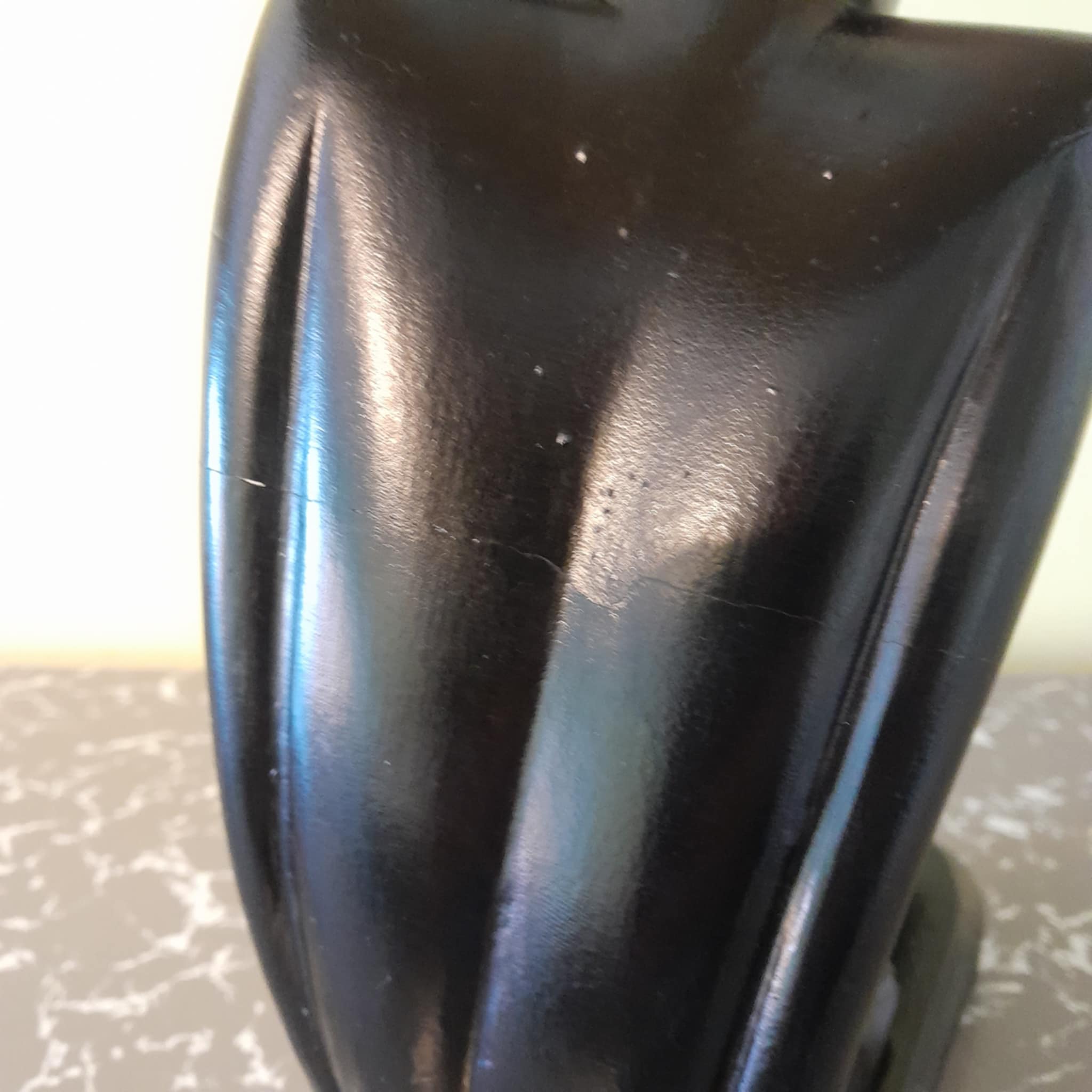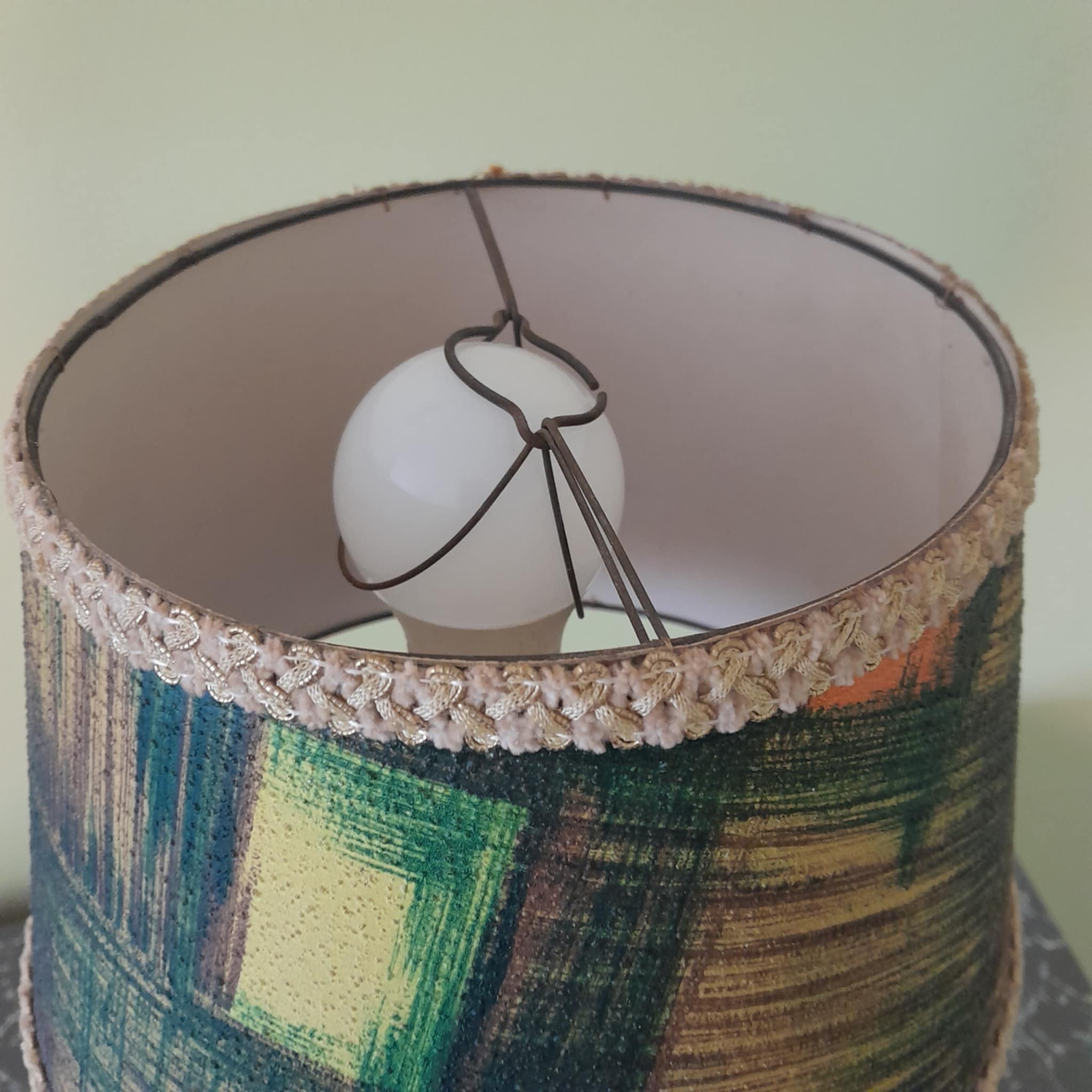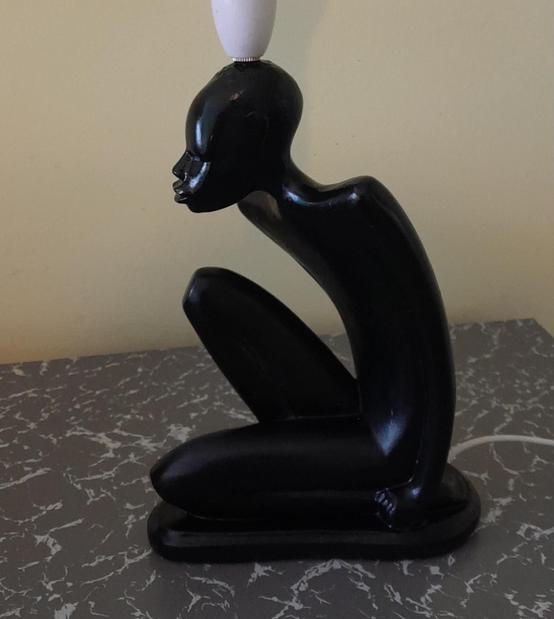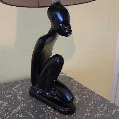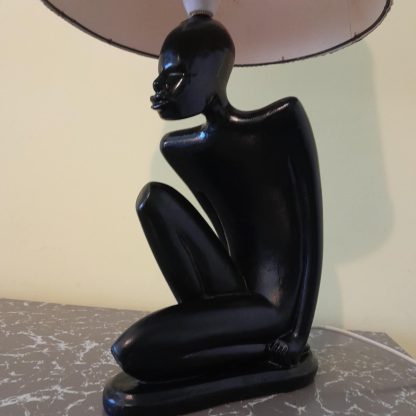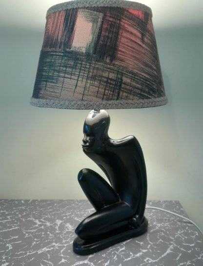 Unusual male African Lamp. Looks to be Alexander Backer but can only find statues of this figure, no lamps so possibly quite rare. Very mid-century modernist in style. In good vintage condition but has hard to notice crack across his middle and usual age related marks which is normal with chalk ware. These issues can be seen in the photos and are reflected in the price. Paired with a vintage clip on cloth lampshade. 44cm tall with shade 24cm diameter shade