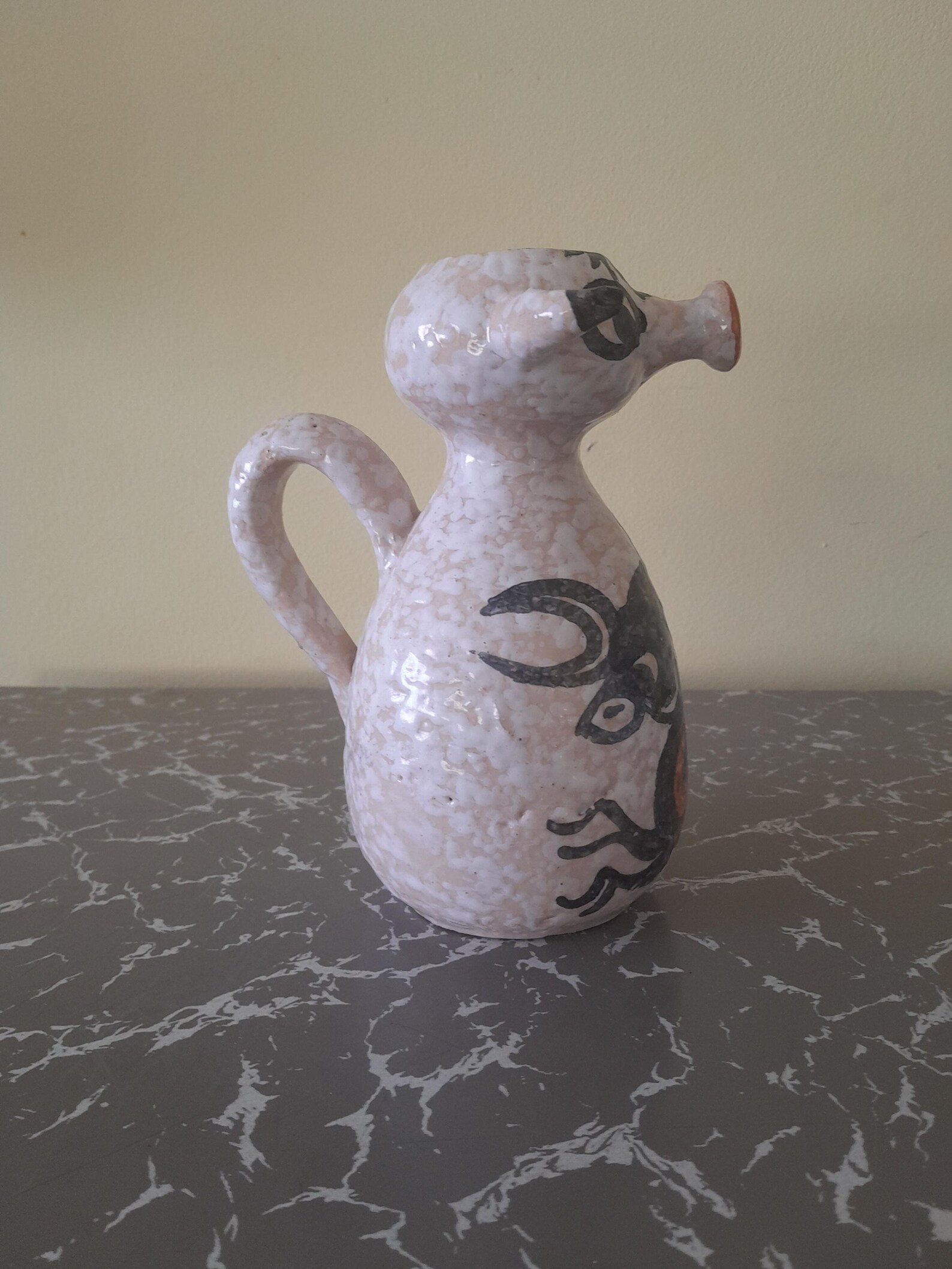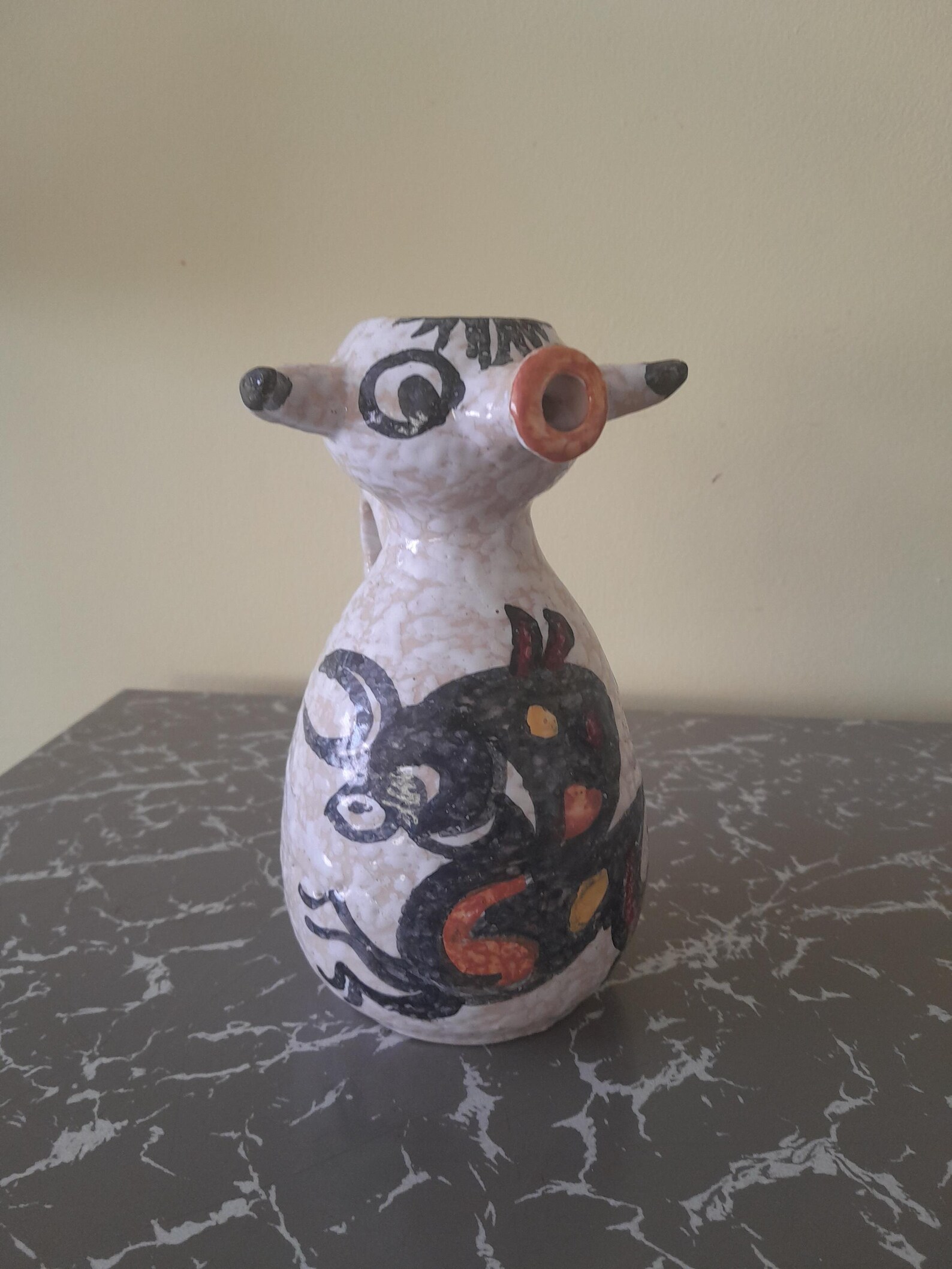 Vintage majollica jug in the shape of a bull. Sought after piece, very collectible. Made in Spain by the Saguino Toledo Pottery. Has a very Pablo Picasso look to the design. Approximately. In very good vintage condition with no chips or cracks.