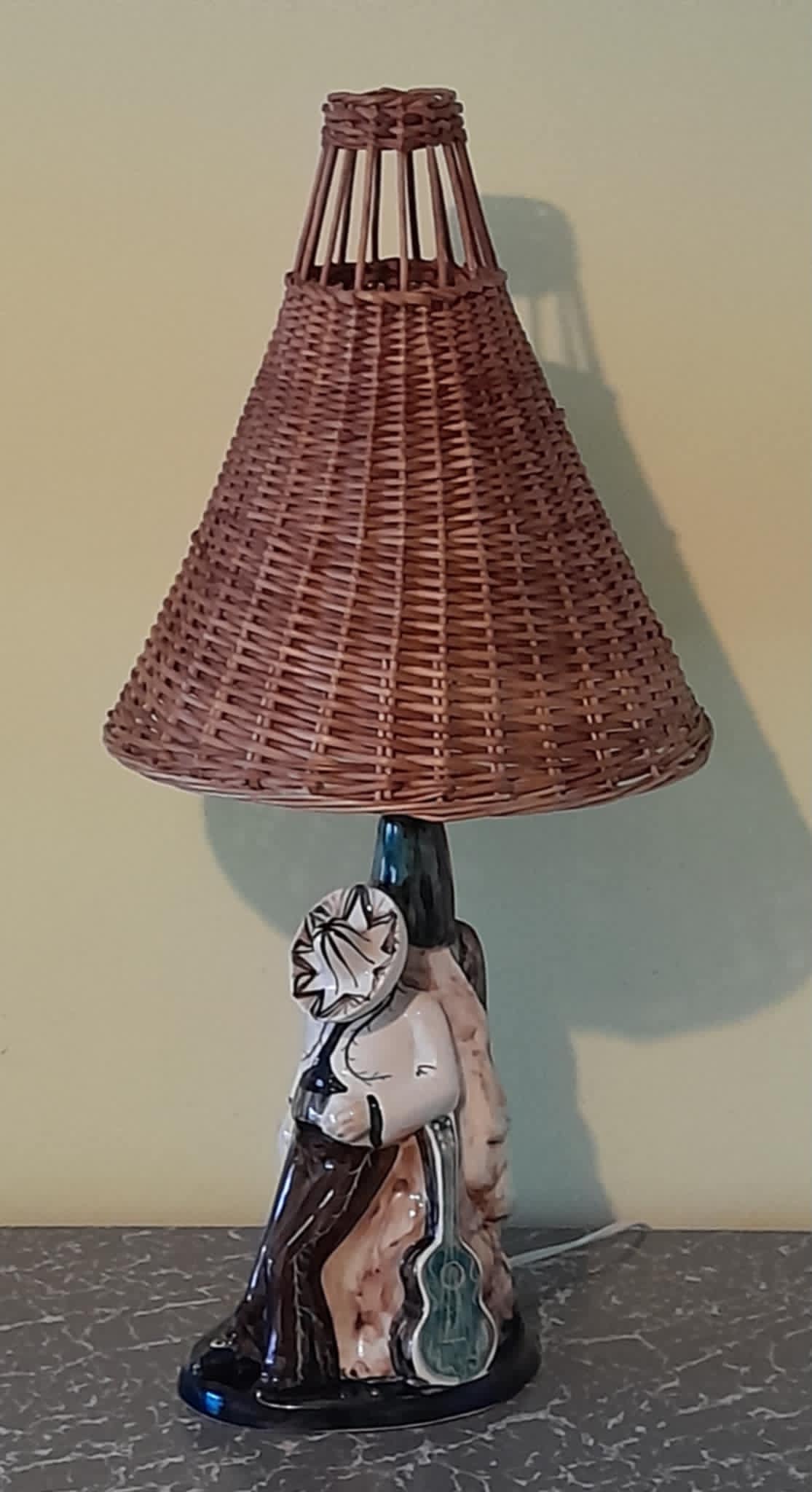 Vintage Jersey pottery “Dreams of Guadalajara” lamp often referred to as “Mexican Siesta” or “Sleeping Mexican” lamp. The ceramic base depicts a sleeping man, often described as a mariachi guitarist with a guitar leaning against a cactus. It is typically hand painted and comes with the original wicker shade. In perfect vintage condition. No chips or cracks. The wicker lampshade is also in great condition.