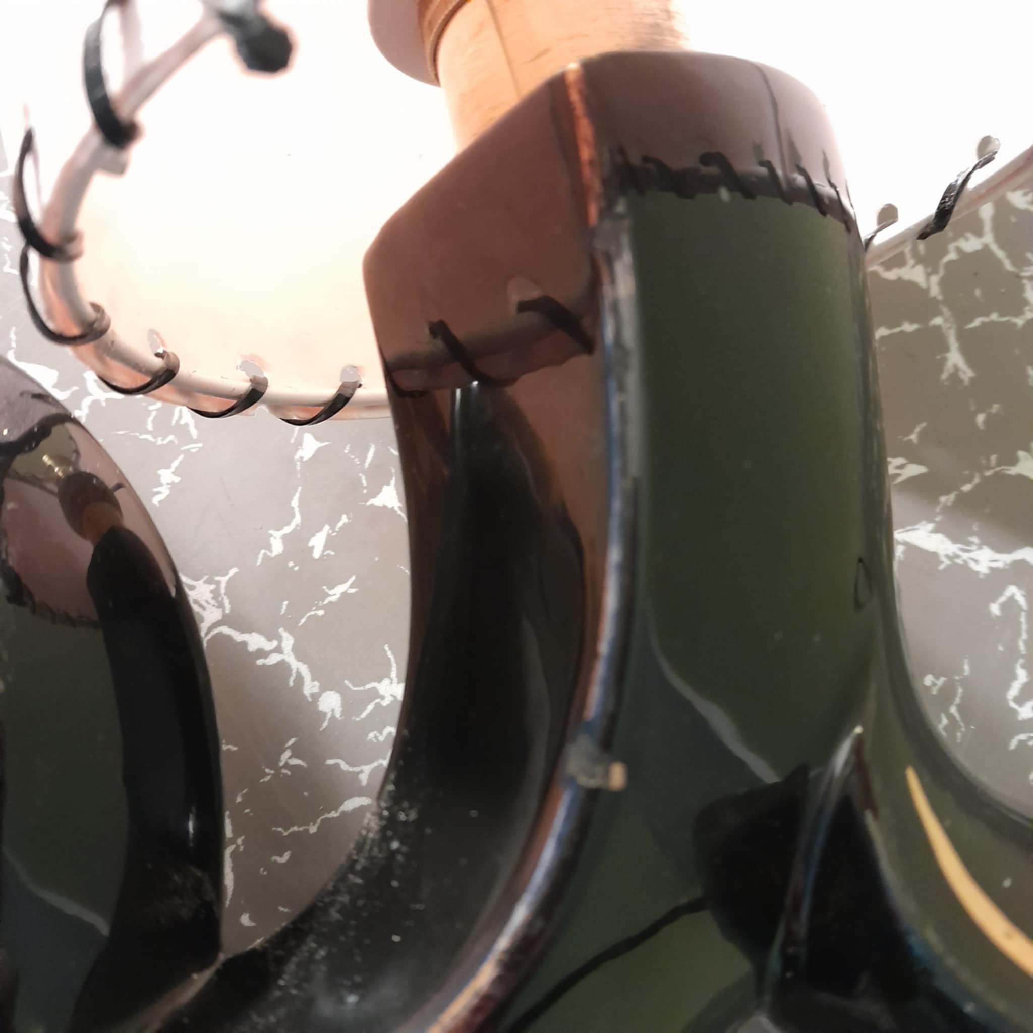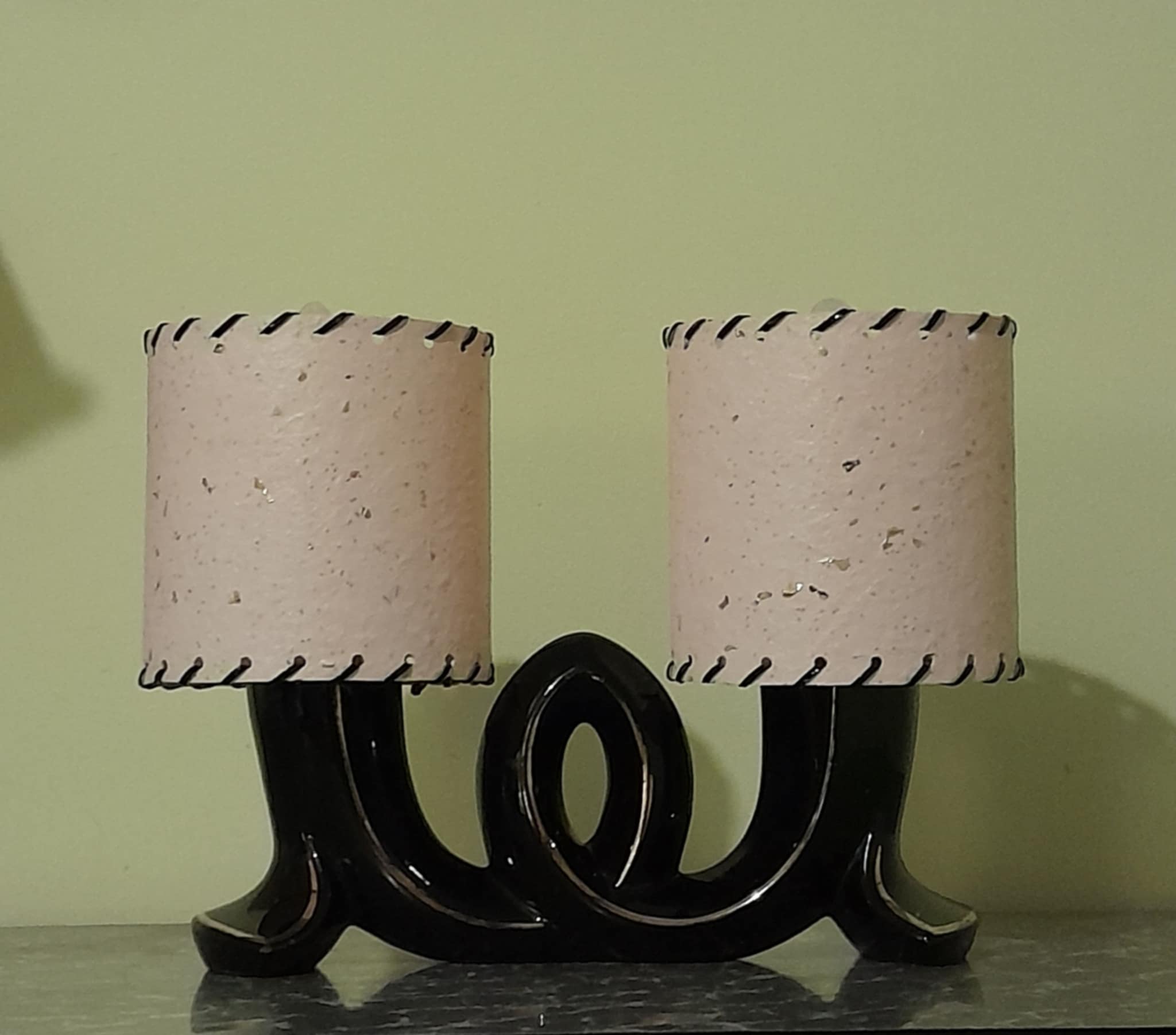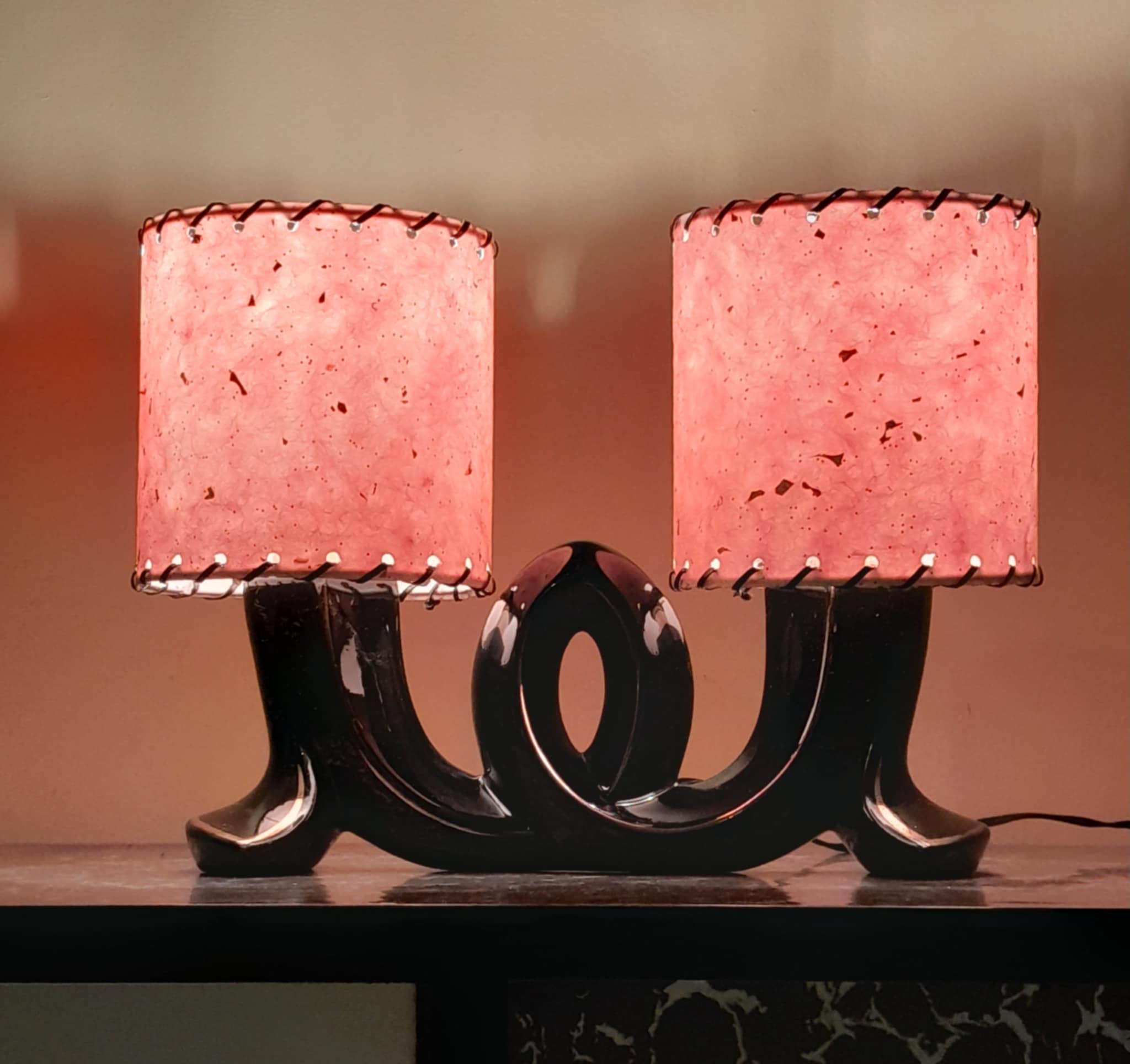 A rare and very unusual ceramic table lamp never seen another very abstract unsure of the country of origin possibly American? The lamp is in great condition except for a small chip on the reverse side so cant be seen and the usual wear on the gold linage, no cracks. finished with a pair of Retrashade fibreglass shades with gold fleck .
