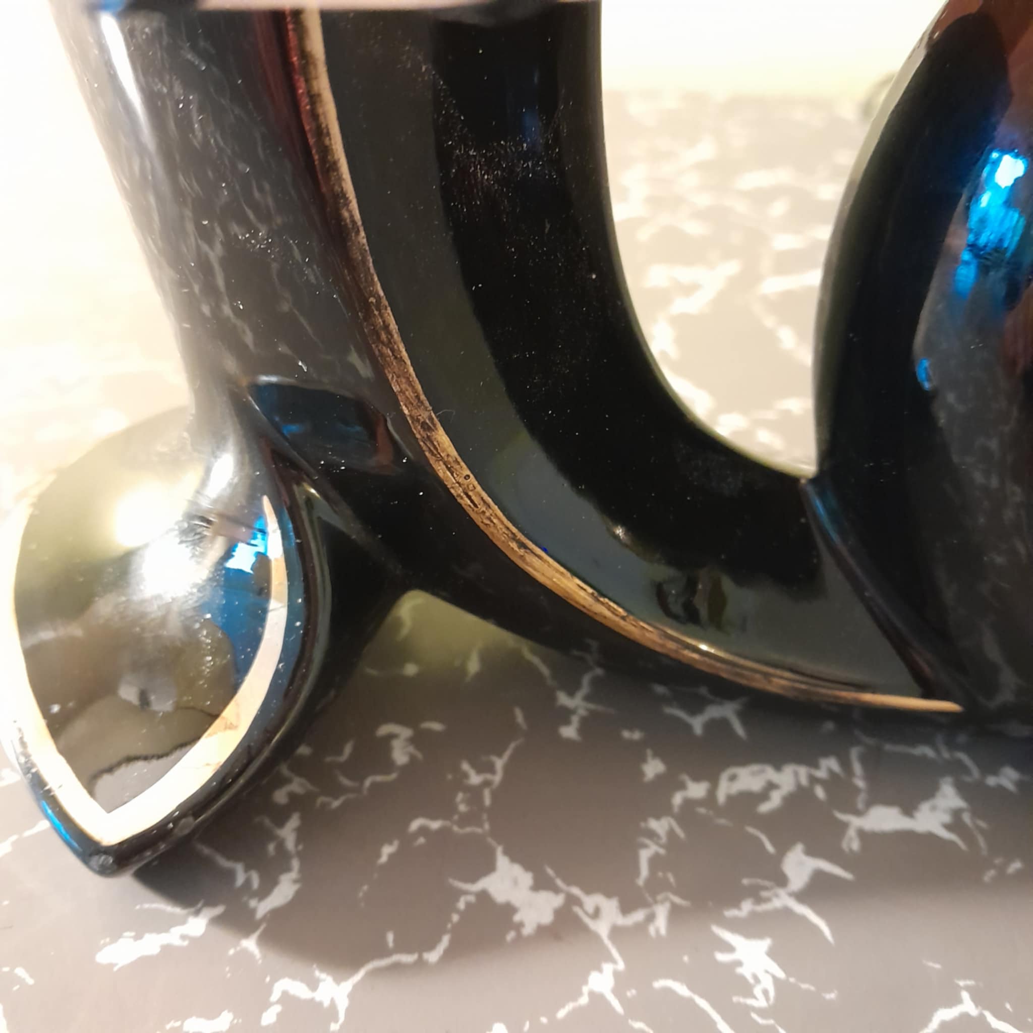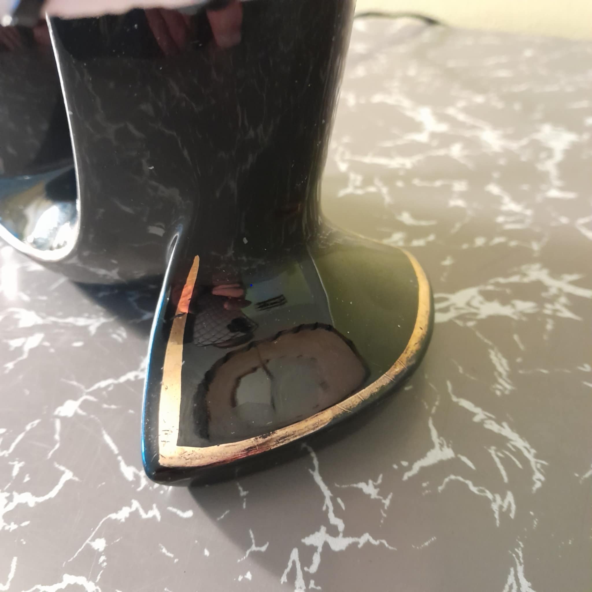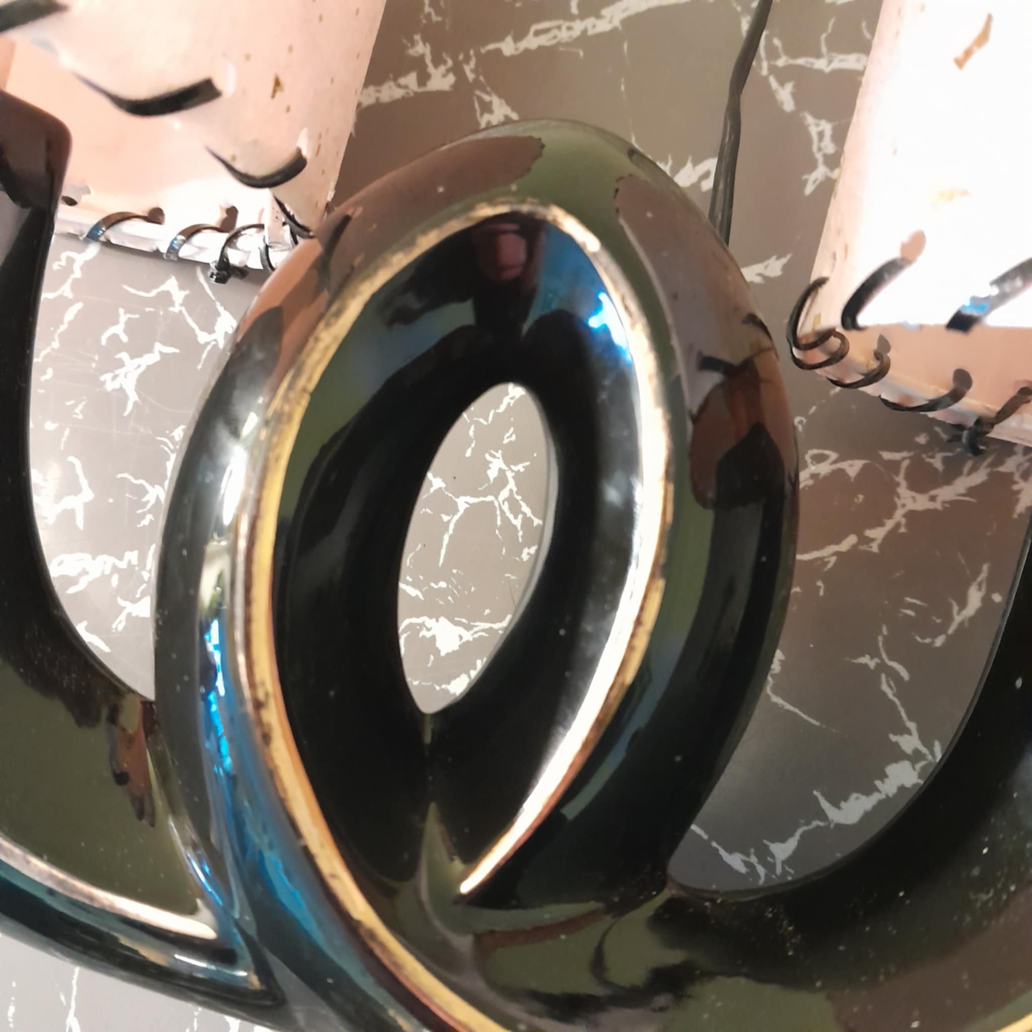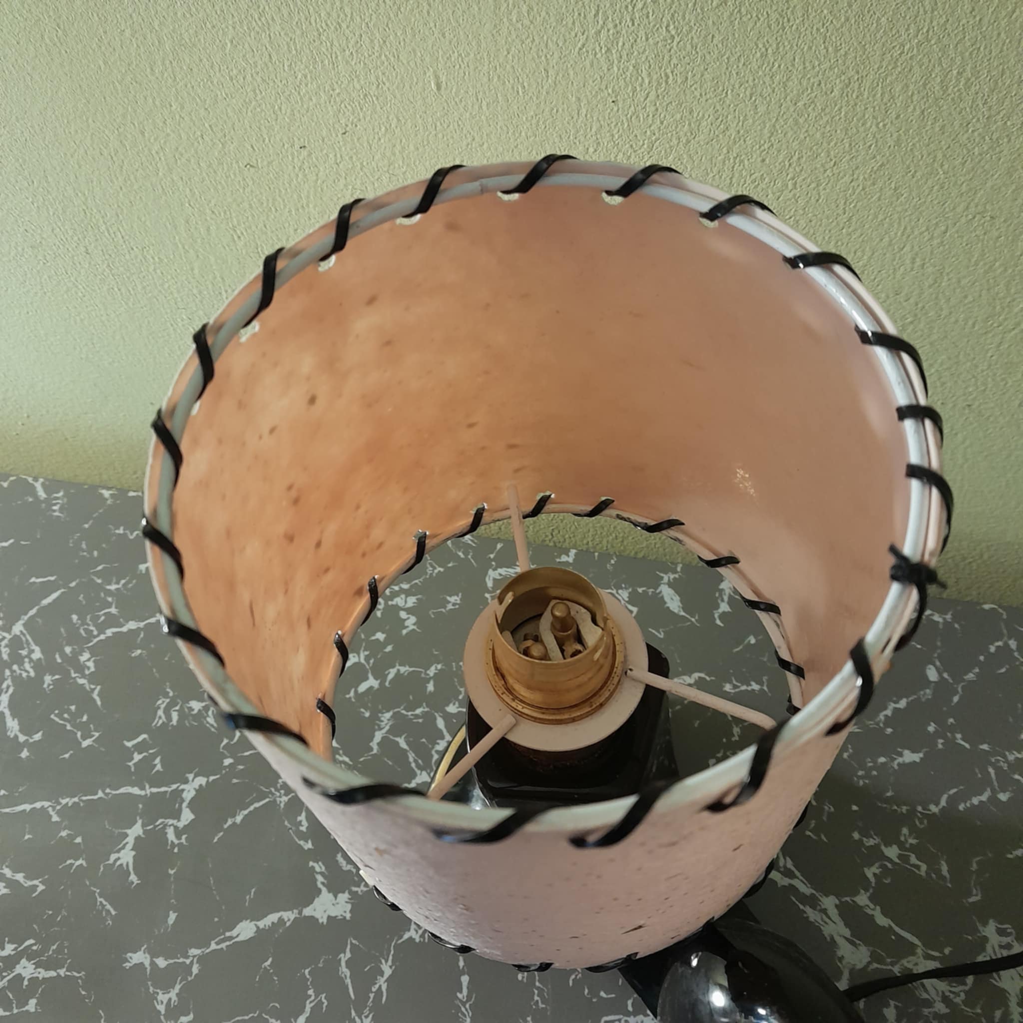 A rare and very unusual ceramic table lamp never seen another very abstract unsure of the country of origin possibly American? The lamp is in great condition except for a small chip on the reverse side so cant be seen and the usual wear on the gold linage, no cracks. finished with a pair of Retrashade fibreglass shades with gold fleck .