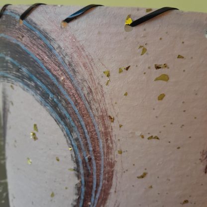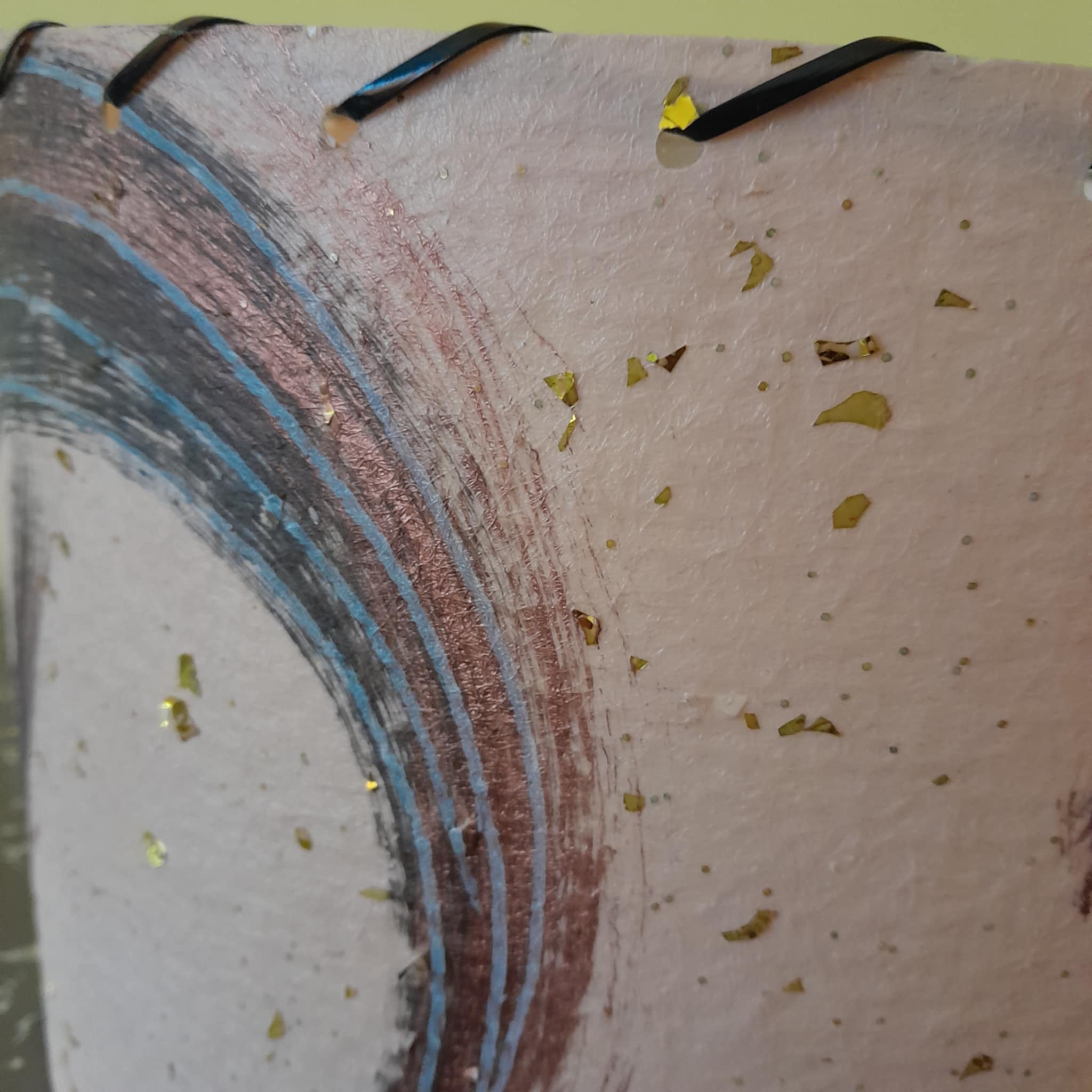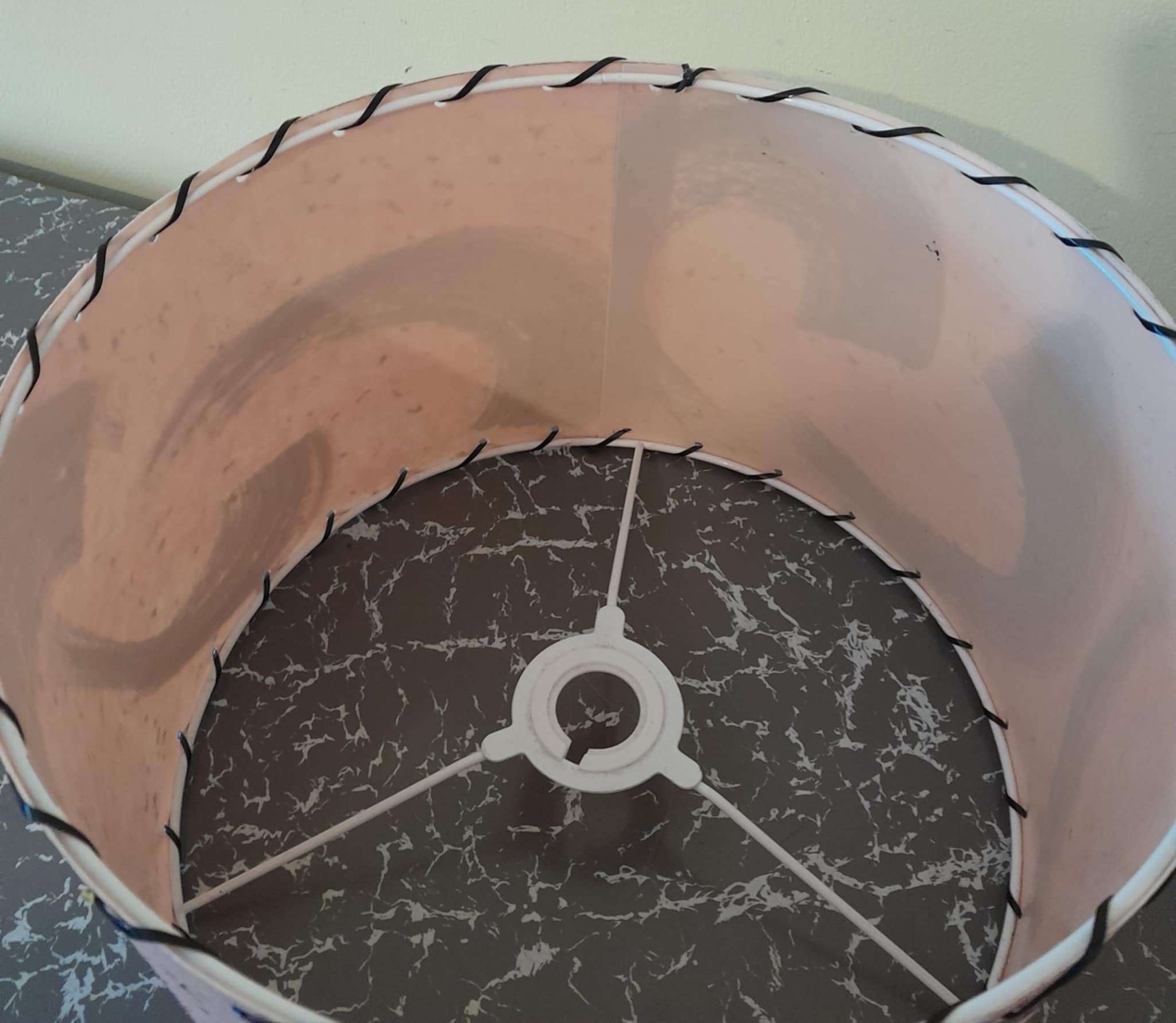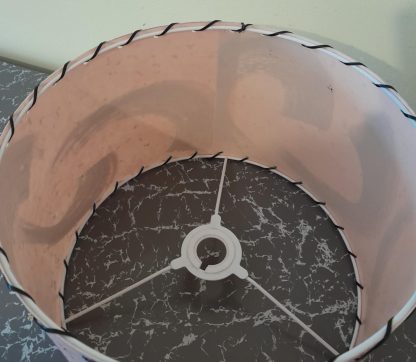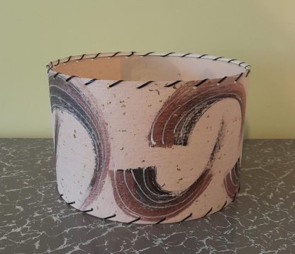 1950’s style fibreglass drum lampshade in peach with atomic swirl pattern in bronze and black and gold fleck. Finished with black whip lace. Suitable for a lamp base or for use as a ceiling shade.