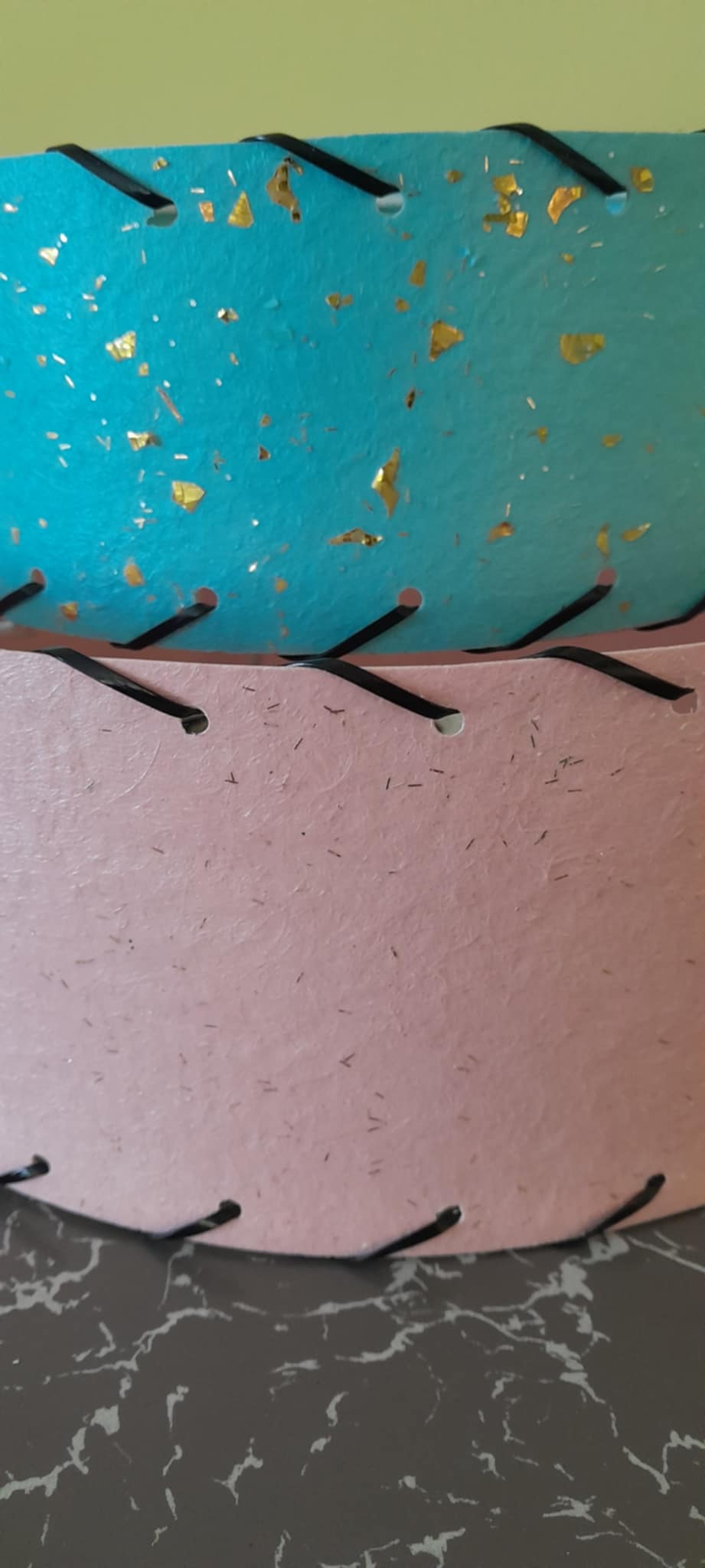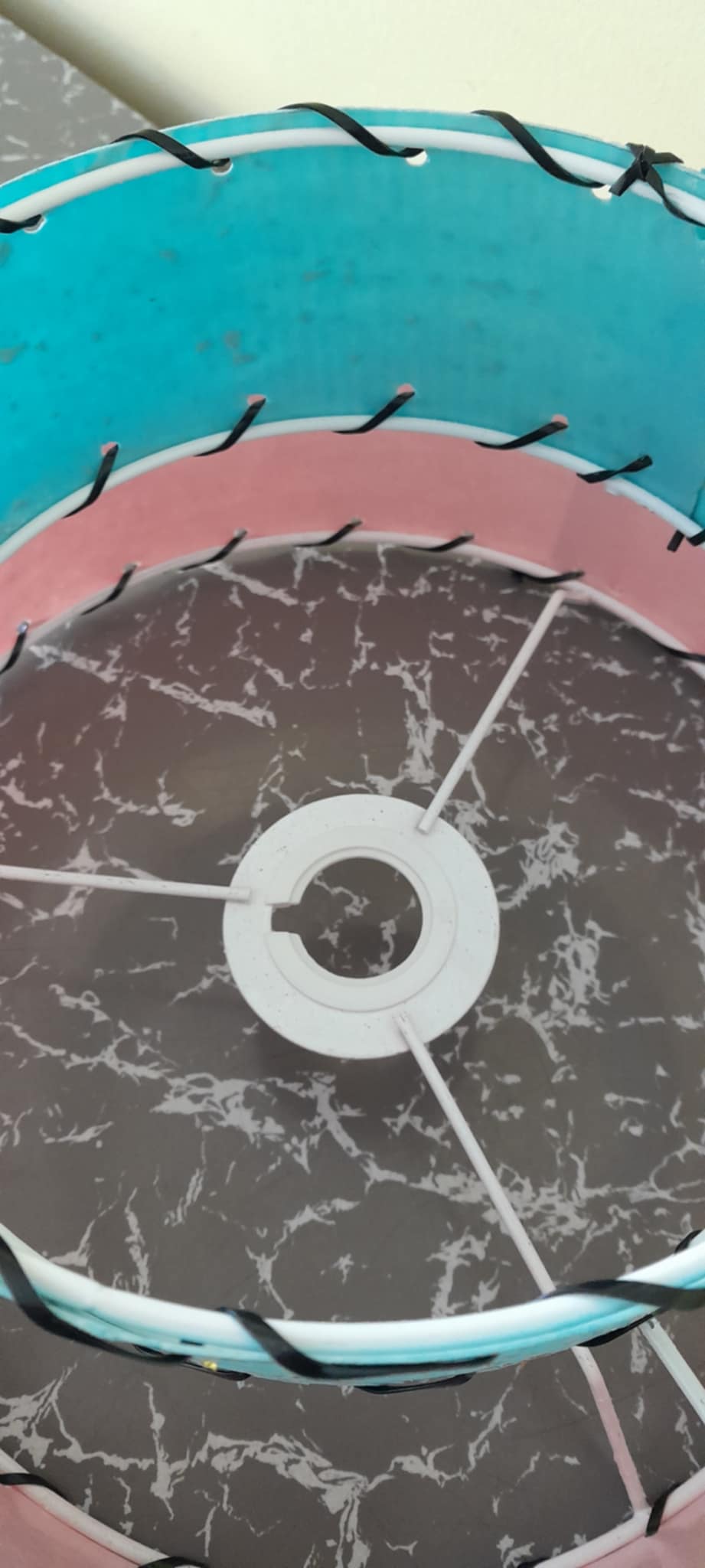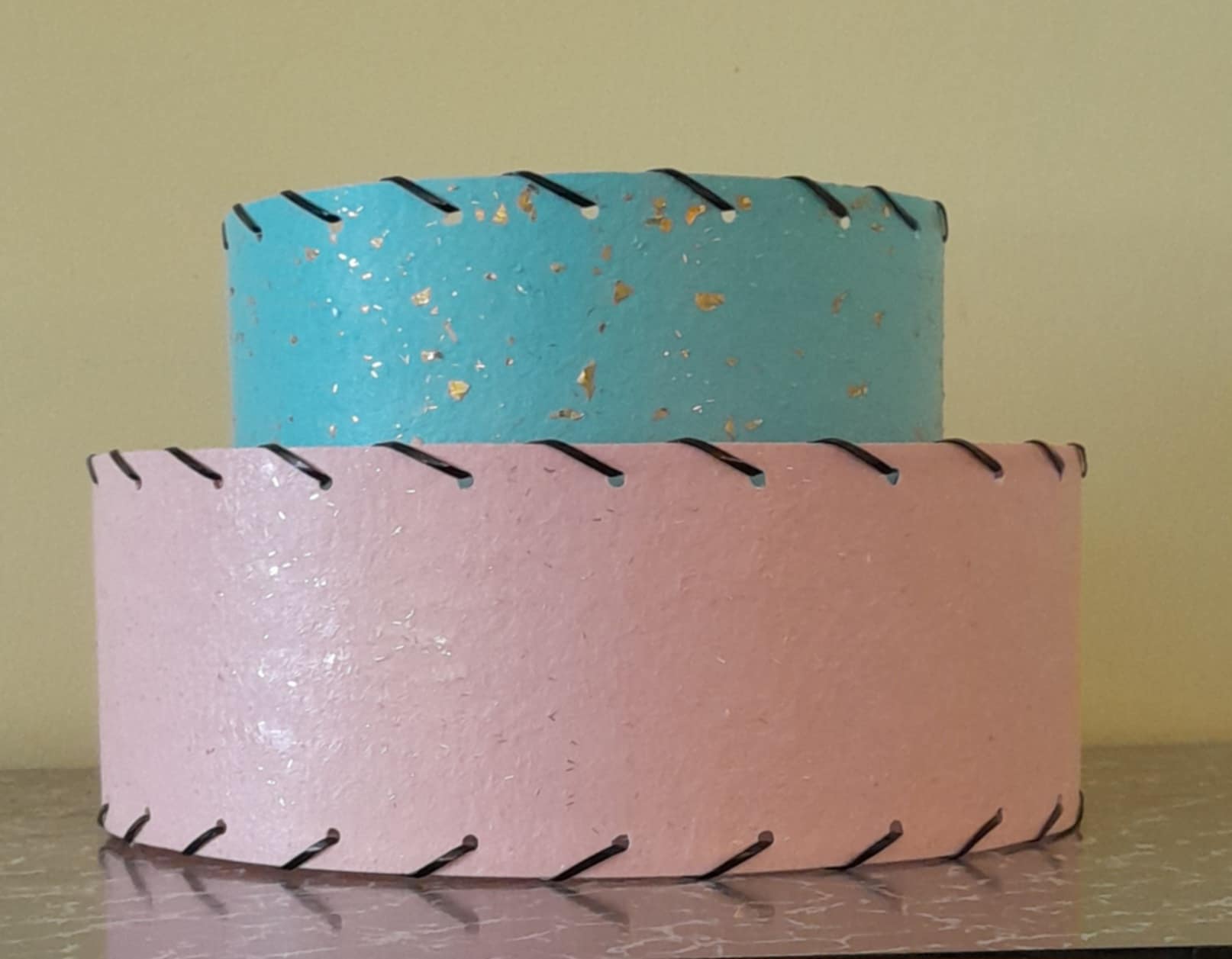 1950’s style 2 tier fibreglass in pink and blue with gold glitter and gold fleck. Finished with black whip lacing. Standard UK fitting, can be used on a lamp base or as a ceiling shade with the smaller tier hanging downwards