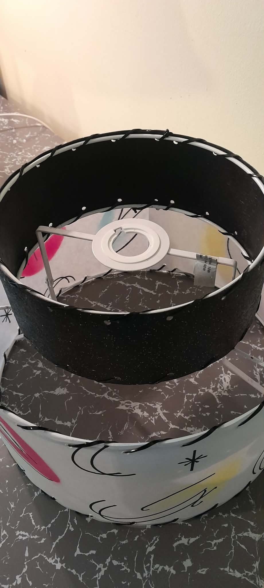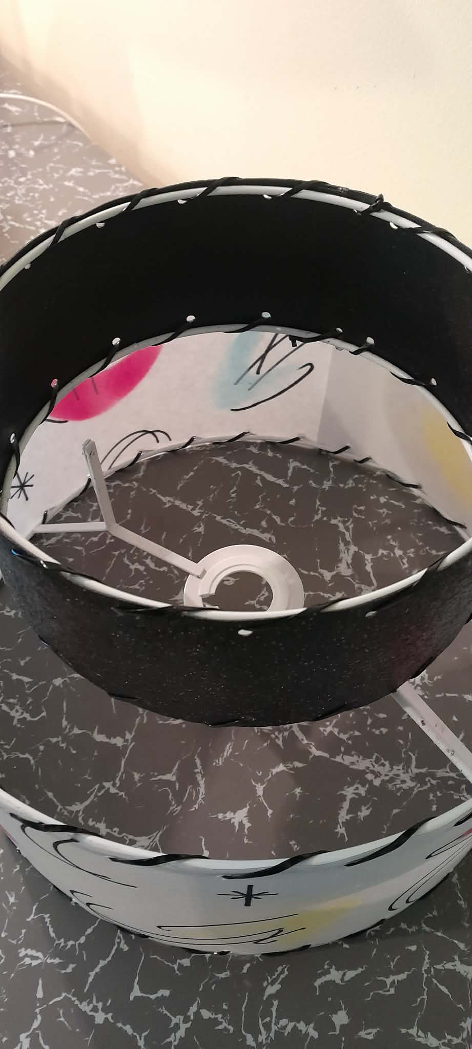 1950’s style 2 tier lampshade with larger tier in white parchment paper with atomic boomerang pattern in pink, lemon and blue. The smaller tier is black fibreglass with gold glitter. Finished with black whip lacing. 30cm diameter and 21cm tall. This shade is suitable for use on a lamp base or as a ceiling shade. It has a universal fitting enabling it to be used with either the small tier or large tier to hang downwards.