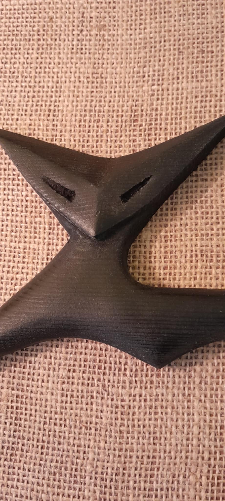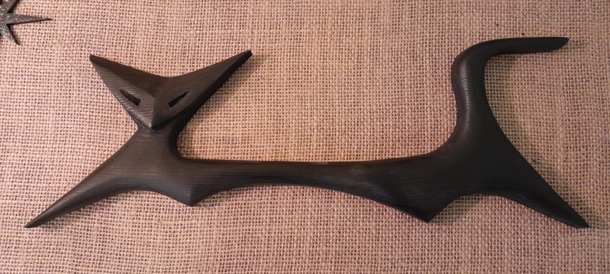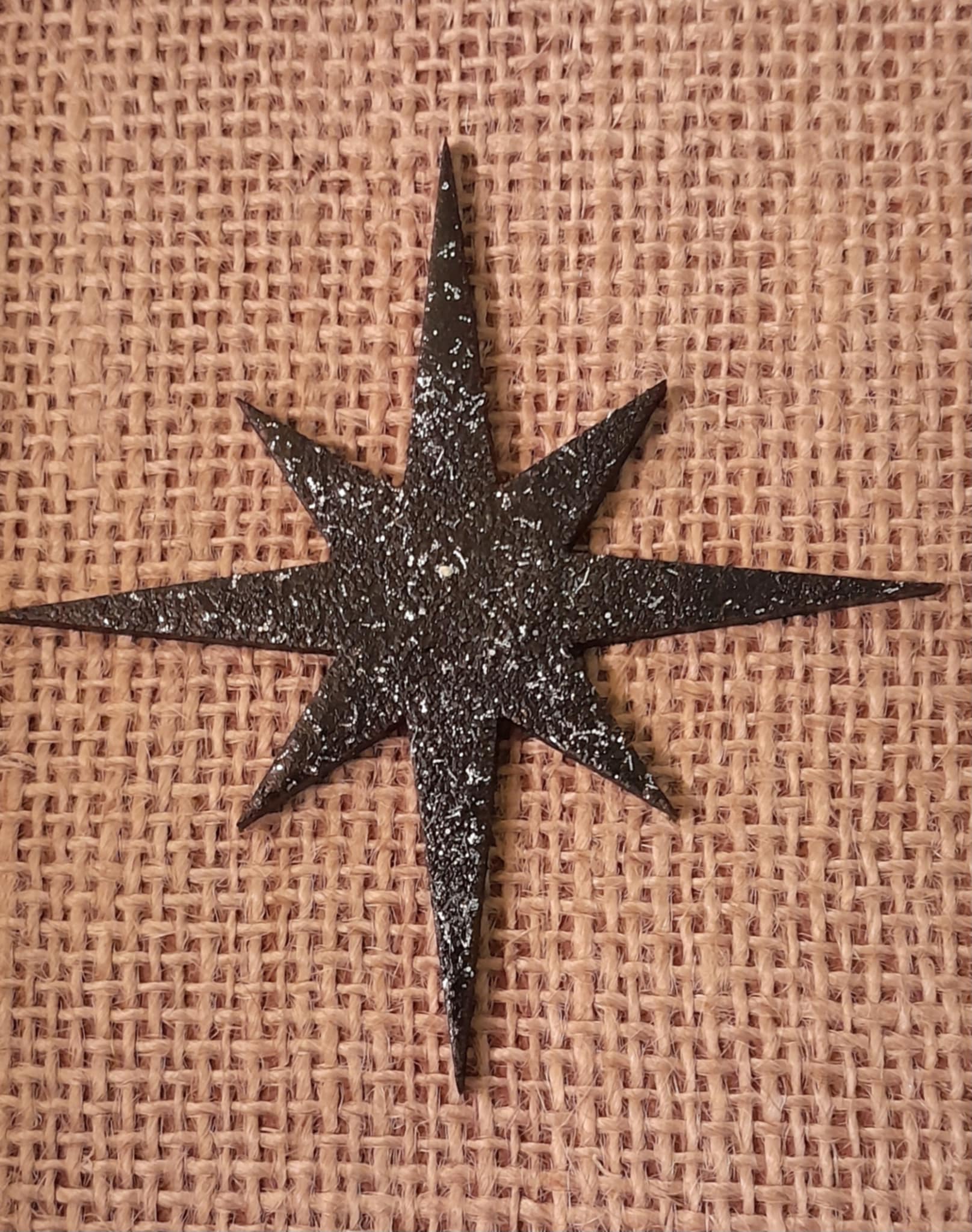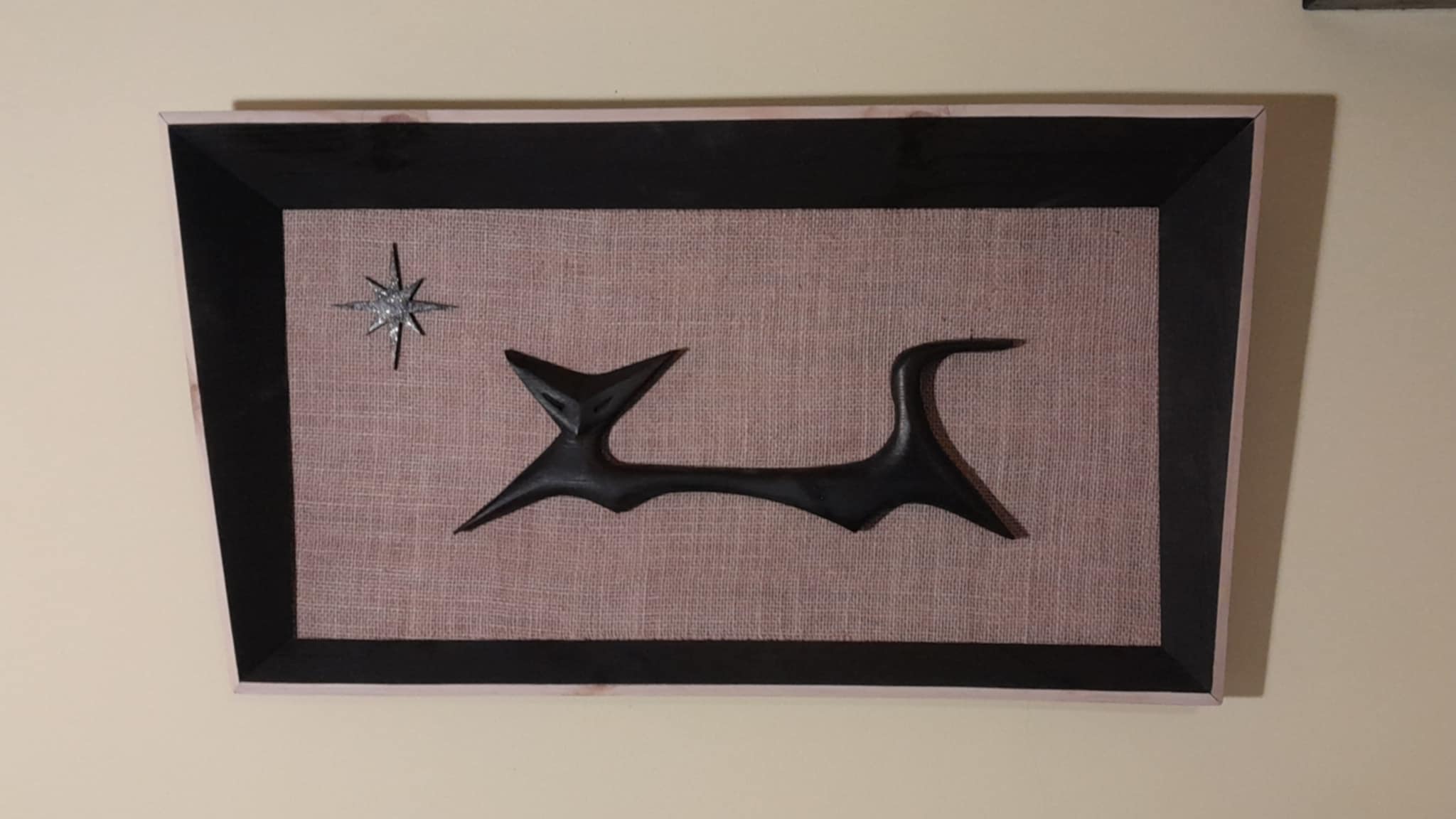 A Retrashade carved wooden atomic cat in black, which measures 38cm long, mounted, along with a star in black and silver on hessian backing within a forced perspective Carlo Of Hollywood style frame in black with a natural wood edge.