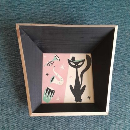 Fabulous retro picture of a cat wearing a fez hat with musical instruments, set in a Retrashade forced perspective frame, in black and natural wood.
