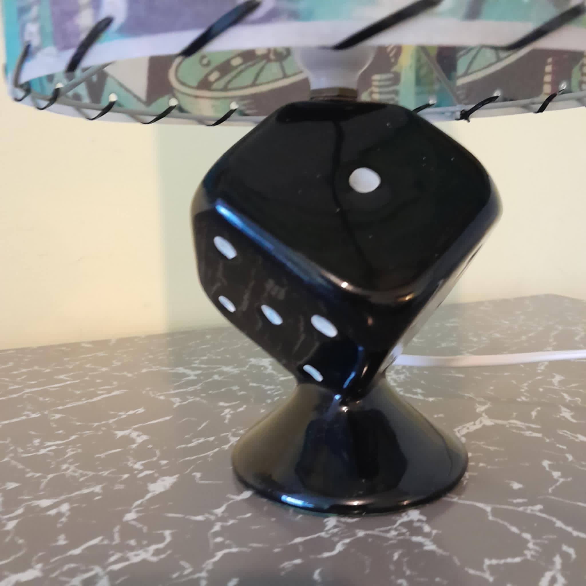 Retro black ceramic dice lamp with white dots in good condition paired with Retrashade printed fibreglass drum lampshade depicting the iconic ‘Hotel El Rancho Vegas’