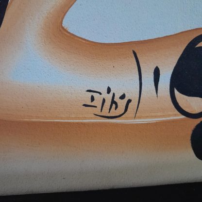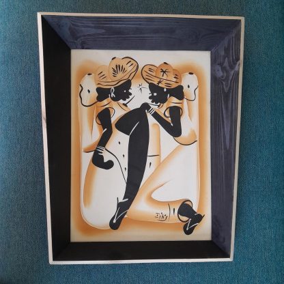 Vintage signed wall art, possibly in acrylic paint, the colour is very vibrant. Depicts two Caribbean women. There are a few marks on the canvas as expected but nothing that takes away from the fabulous artwork. Set in a Retrashade forced perspective black with a natural wood edge